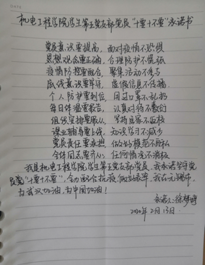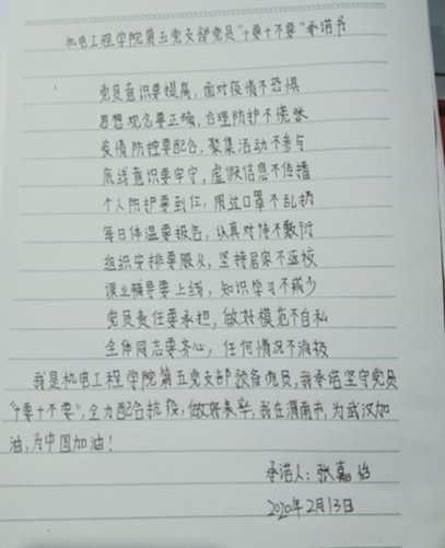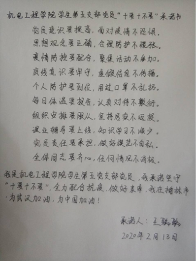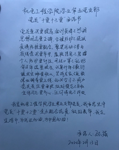 支部书记黄彦军、支委会成员王聪聪和党员代表张嘉怡共同拟定了全球最大顶级体育平台员工第五党支部党员“十要十不要”承诺书。王聪聪同志代表支部全体党员宣读全球最大顶级体育平台员工第五党支部防范疫情“十要十不要”承诺书。全体党员手写承诺书并签字。