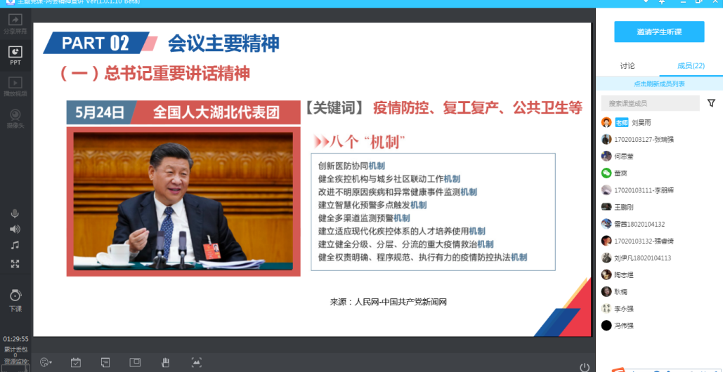 刘昊雨首先带领支部全体同志学习“两会”精神。他从两会热词角度为党员们讲解了2020年全国两会的政治背景知识和会议议程,深入了解两会热词,从“六保”、“六稳”、“生命至上”、“数字经济新优势”等两会热词出发学习领悟两会内容和精神。支部党员共同观看了一段视频《今年两会不平凡》,了解今年两会值得关注的7大看点:新冠疫情防控、今年经济社会发展目标、脱贫攻坚、全面建成小康社会、民法典草案、民生保障、外部环境应对。