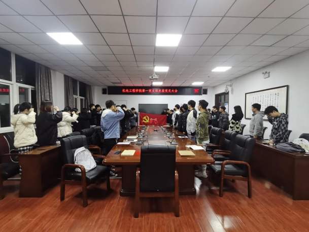 本次会议由两部分组成,第一部分为发展预备党员,主要对张乐,许再标,许韬,柏乐,张佳鑫等五名发展对象转为预备党员进行票决,其先对自己的情况进行介绍,之后由入党介绍人对其进行评价,并提出需要改进的地方,最终同意其转为预备党员。第二部分由张岩带领大家对着党旗进行宣誓,新加入的和之前的老党员每个人都参与其中,宣誓的内容让人热血澎湃,每个人铿锵有力的声音振奋人心。