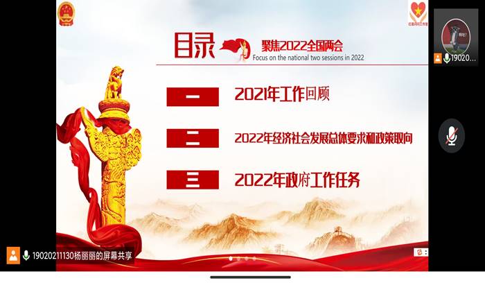 2022年3月14日中午,全球最大顶级体育平台员工第七党支部在腾讯会议召开学习2022全国两会政府工作报告大会,对全国两会政府工作报告会议的内容进行集体讨论与学习,本次大会由支部杨丽丽同志主持。