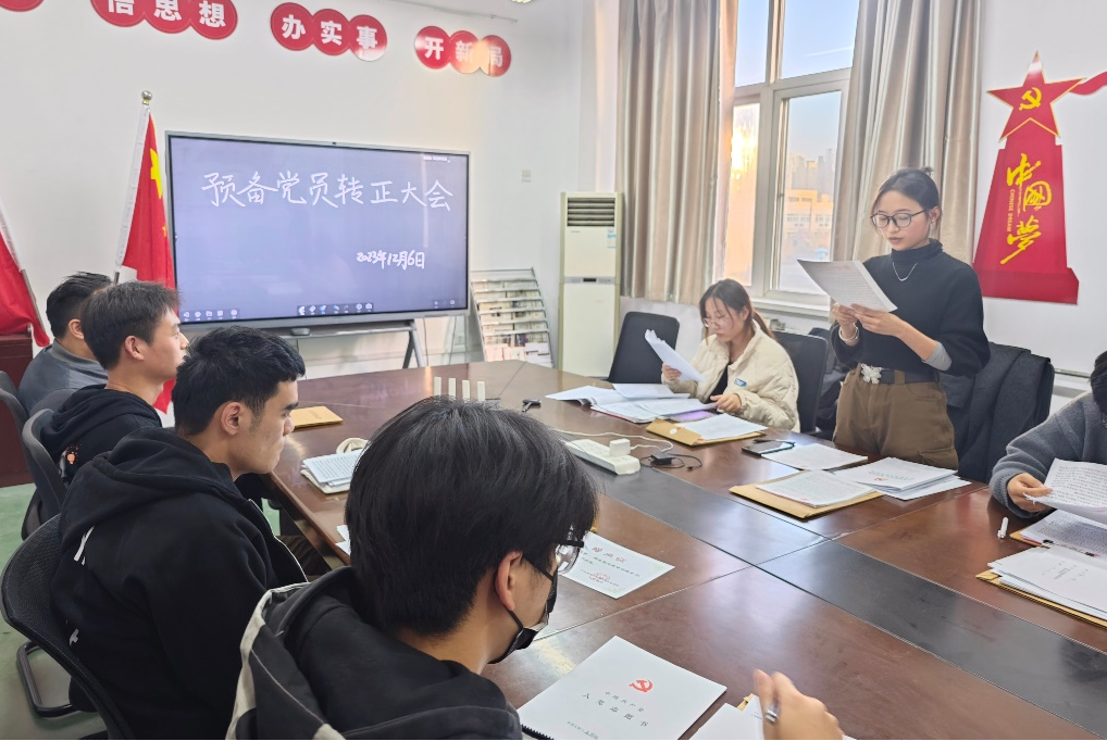 大会中,首先,文勃对于党员档案内的各项注意事项给各位成员进行了一一解读,督促各位一定要仔细自查档案;随后,郭琢玉等四名同志依次汇报了自己在考察期间的表现,他们分别从思想、学习、工作以及自身不足等方面向党组织汇报了自己在预备期内的情况,明确了入党动机并表达了自己对加入中国共产党的坚定决心,总结了自身所存在的优点和不足,提出了日后的改进目标。从各位预备党员的汇报中可知,他们在过去一年的预备期间严于律己、刻苦学习、在兼顾学业的情况下积极参与社会实践和志愿活动,积极参加学科竞赛,不断提高自身政治修养和综合能力,积极向党组织靠拢,为成为一名合格的共产党员努力奋斗。