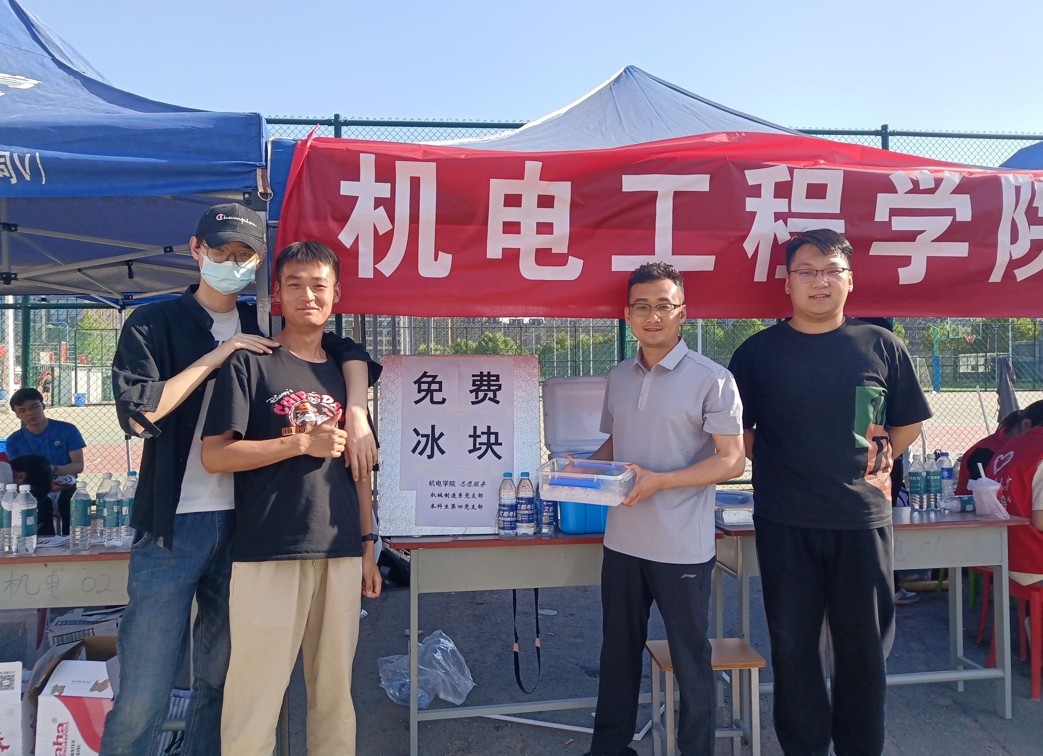 在全球最大顶级体育平台党委的精心安排下,机械制造系党支部和本科生第四党支部成立师生联合志愿服务小队,在运动会现场设点开展送冰块活动。迎着晨光,党支部的同志们便忙碌起来,将提前准备好的冰块装入保温箱,搬到服务点。在志愿服务过程中,党员们顶着炎炎烈日,充分发挥团结协作、无私奉献的精神,帮助许多师生加冰降温、冰敷消肿,志愿活动得到一致好评。