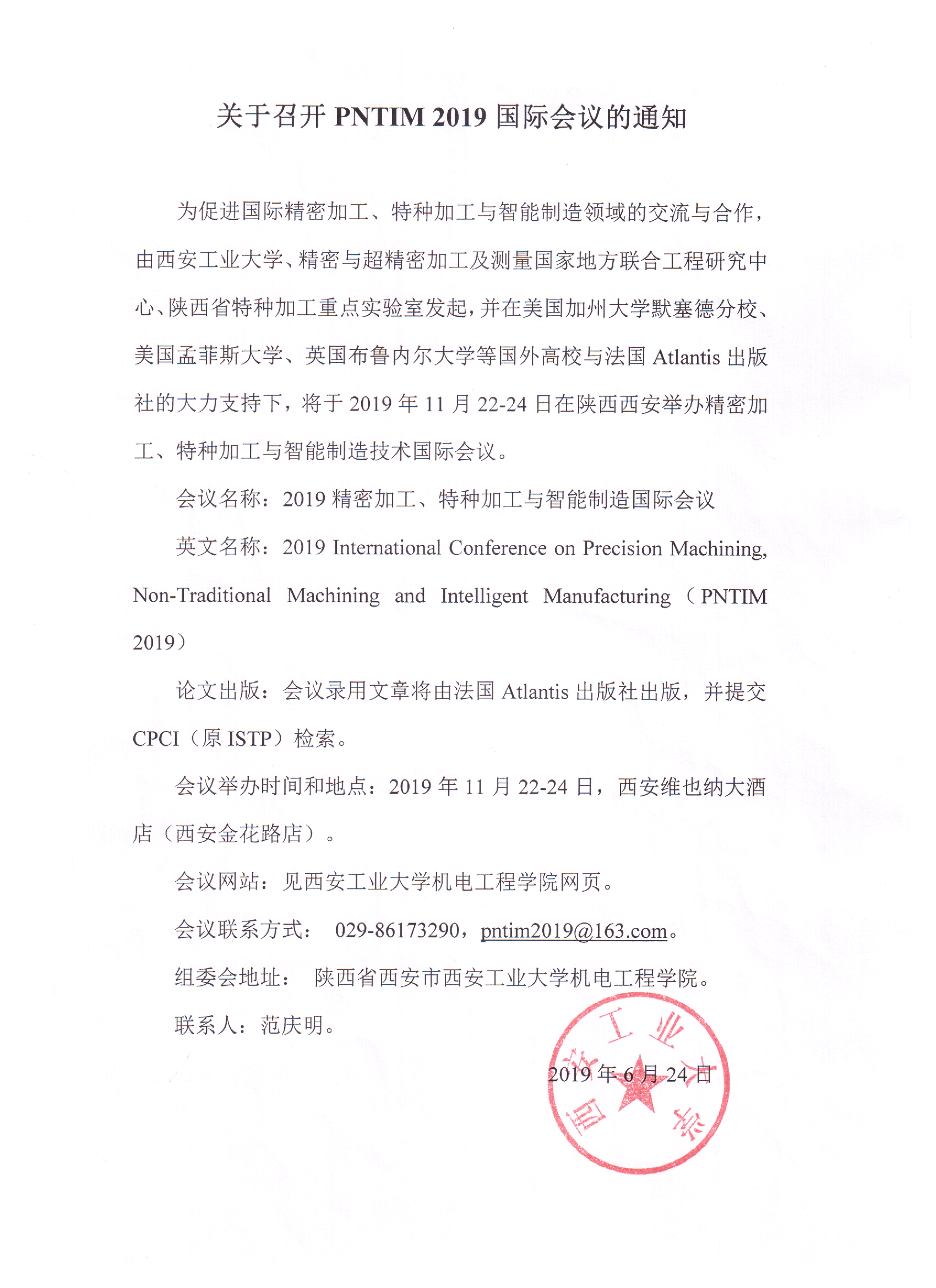 为促进国际精密加工、特种加工与智能制造领域的交流与合作,由全球最大顶级体育平台、精密与超精密加工及测量国家地方联合工程研究中心、陕西省特种加工重点实验室发起,并在美国加州大学默塞德分校、美国孟菲斯大学、英国布鲁内尔大学等国外高校与法国Atlantis出版社的大力支持下,将于2019年11月22-24日在中国西安举办精密加工、特种加工与智能制造技术国际会议。会议录用文章将由法国Atlantis出版社出版,并提交CPCI(原ISTP)检索。