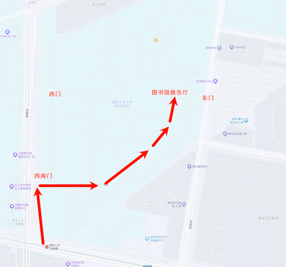 a)公共交通方式:地铁14号线西安工大武德路站,下车——沿下图中红色路线,由西南门进入校园,沿环形路直行至图书馆(有志愿者引导)。