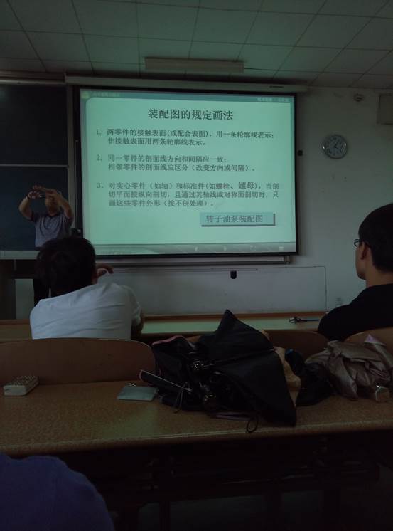 讲座一开始,高教授首先向同学们讲解了规范使用AutoCAD制图的重要性。随后高教授运用自己制作的PPT,采用一边讲解规范要求一边举例的方式向同学们详细讲解了装配图的规定画法、技术要求、所需表达的内容和装配图的七种特殊表示方法。紧接着,高教授拿出自己所带员工的图纸并结合历届毕业图纸中存在的问题与经验,就AutoCAD制图格式规范方面容易出现的问题进行了例举,并现场传授同学们设置标注字体的方法。