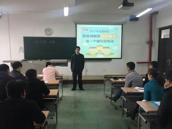 最后由张晖老师带领大家一同学习了两会期间与教育领域相关的提议,其中包括教育信息化,教育扶贫,民办教育,校园安全,随迁子女就学,减轻员工课业负担,高考改革,校园贷现象的政策等。张晖老师要求各位党员要经常关注国家时政要闻,要以优秀党员的标准要求自己,感染其他同学,使研究生的管理上升到一个新的平台。