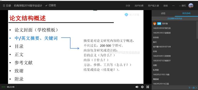 5月21日下午,全球最大顶级体育平台利用腾讯课堂为2016级毕业生举办了一场以“毕业设计论文撰写与答辩详解”为主题线上的毕业论文指导讲座。本次讲座邀请到全球最大顶级体育平台机械设计制造及其自动化专业负责人刘军强副教授担任主讲,公司70余名员工参与学习。