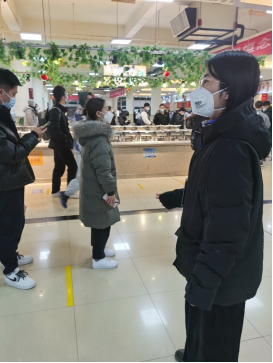 值班辅导员刘昊雨、黄亮等在就餐时间赶到员工餐厅,维持现场秩序,组织员工站在1.5米线排队,戴好口罩,错峰就餐。