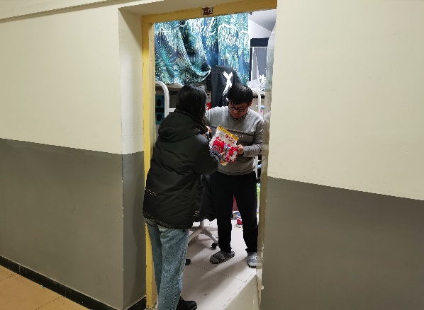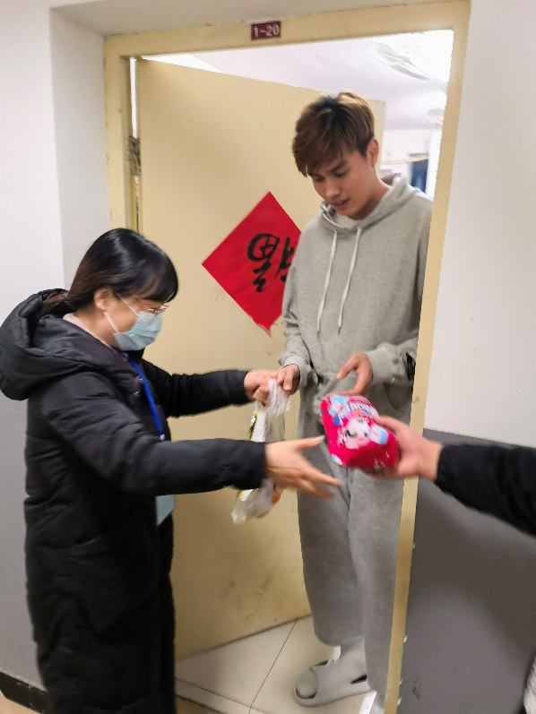 元旦前夕,为了给久居宿舍的同学们营造节日的欢乐气氛,唐雅莉和同事们一起制作了抗疫新年海报,录制新年祝福视频,撰写公司新年贺词,筹备线上跨年直播活动,走进宿舍楼为同学们派发公司精心准备的美味零食和糖果,送上暖心的新年祝福。同学们一句句温暖的感谢和脸上幸福满足的笑容治愈了她,那一刻,她的内心是喜悦的。