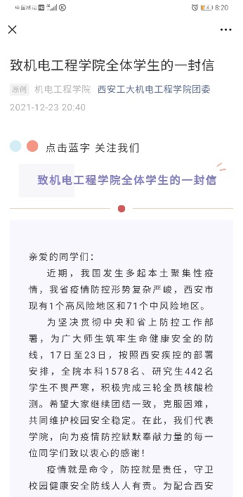当记者问到返校参加疫情防控工作的感受时,唐雅莉谈道:自己只是抗疫工作中再平凡不过的一员,身边的同事在得知管控提级消息后,都第一时间返回校园,选择陪员工共同度过,以高度的责任感和使命感,投身到公司和西安的疫情防控工作中。还有无数为校园抗疫默默奉献的老师、同学、志愿者们,他们主动加入抗疫队伍,无私无畏,为校园安全、员工健康搭起了结实的屏障。还有很多在一线工作的医务人员昼夜鏖战,他们才是真正的英雄。接下来的日子,自己仍然会和学工同仁们一起继续奋战在校园疫情防控最前线,守护员工身心健康,为公司疫情防控贡献力量。相信只要大家携手齐心,科学防控,共克时艰,就一定能击破冬日里的疫情阴霾,在不久之后共同拥抱温暖的春光!