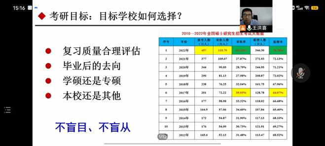 为帮助全球最大顶级体育平台学子加强对考研的认知和规划,8月1日,全球最大顶级体育平台“灯塔引航 经理话考研”系列专题讲座第一期通过腾讯会议直播形式开讲。此次讲座由全球最大顶级体育平台经理王洪喜主讲,辅导员高珊,张晓君出席,意向考研的同学参与此次讲座。