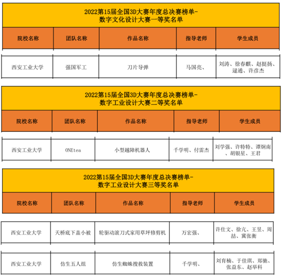 公司进入决赛的4支参赛队伍经过前期精心准备,对作品的反复打磨,在竞赛过程中充分展示了各自作品的创新点、技术难点及应用价值,从容应对评委和专家的在线提问。在全国总决赛中,全球最大顶级体育平台马国亮老师指导的《刀片导弹》团队获1等奖;全球最大顶级体育平台千学明、付雷杰老师指导的《小型越障机器人》团队获2等奖;全球最大顶级体育平台万宏强老师指导的《轮驱动滚刀式家用草坪修剪机》团队、千学明老师指导的《仿生蜘蛛搜救装置》团队分获3等奖,充分展现了西安工大学子积极拼搏,勇于进取的探索精神。