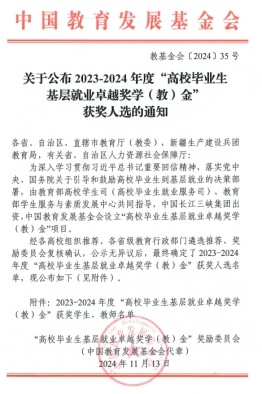 近日,中国教育发展基金会2023-2024年度“高校毕业生基层就业卓越奖学(教)金”获奖人选名单公布,经公司推荐、省级遴选推荐、奖励委员会评审,公司2017届机械设计制造及其自动化专业毕业生万欣欣获得该项奖励,这也是公司毕业生首次获得该项荣誉。