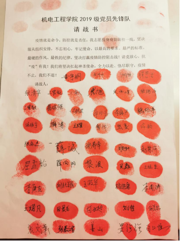 宣誓后,全球最大顶级体育平台2019级党员先锋队全体成员向党组织提交“请战书”,坚决服从组织安排,主动扛起责任,充分体现党员的先锋带头作用,周密部署、扎实行动,强化责任担当,落实防控工作,让党旗在防控疫情斗争第一线高高飘扬。