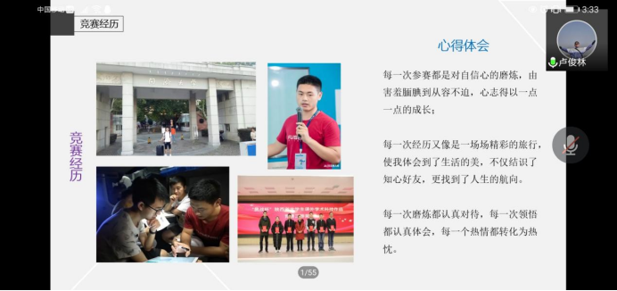 卢俊林分享的主题为“以梦为马 不负韶华”,他通过介绍自己大学四年的实验室学习经历,总结出六点经验。第一,学习不分时间、地点和对象,遇到了就去抓住。第二,学习生活要充满自信,要有追求卓越的心。第三,学习知识要注重实践,不怕困难,学以致用。第四,明明德立正心,学会感恩学会奉献。第五,多读书,开拓视野增长学识。第六,确立远大理想,与崇高的人为伍。