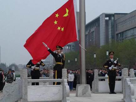 迎着东方升起的第一缕晨曦,升国旗仪式在7点整准时在未央校区经纬广场庄严举行。英姿飒爽的国旗护卫队目光坚毅,迈着铿锵有力的步伐护送国旗入场,伴随着高亢嘹亮的国歌声,全体师生肃然而立,面向国旗行注目礼,齐唱国歌。