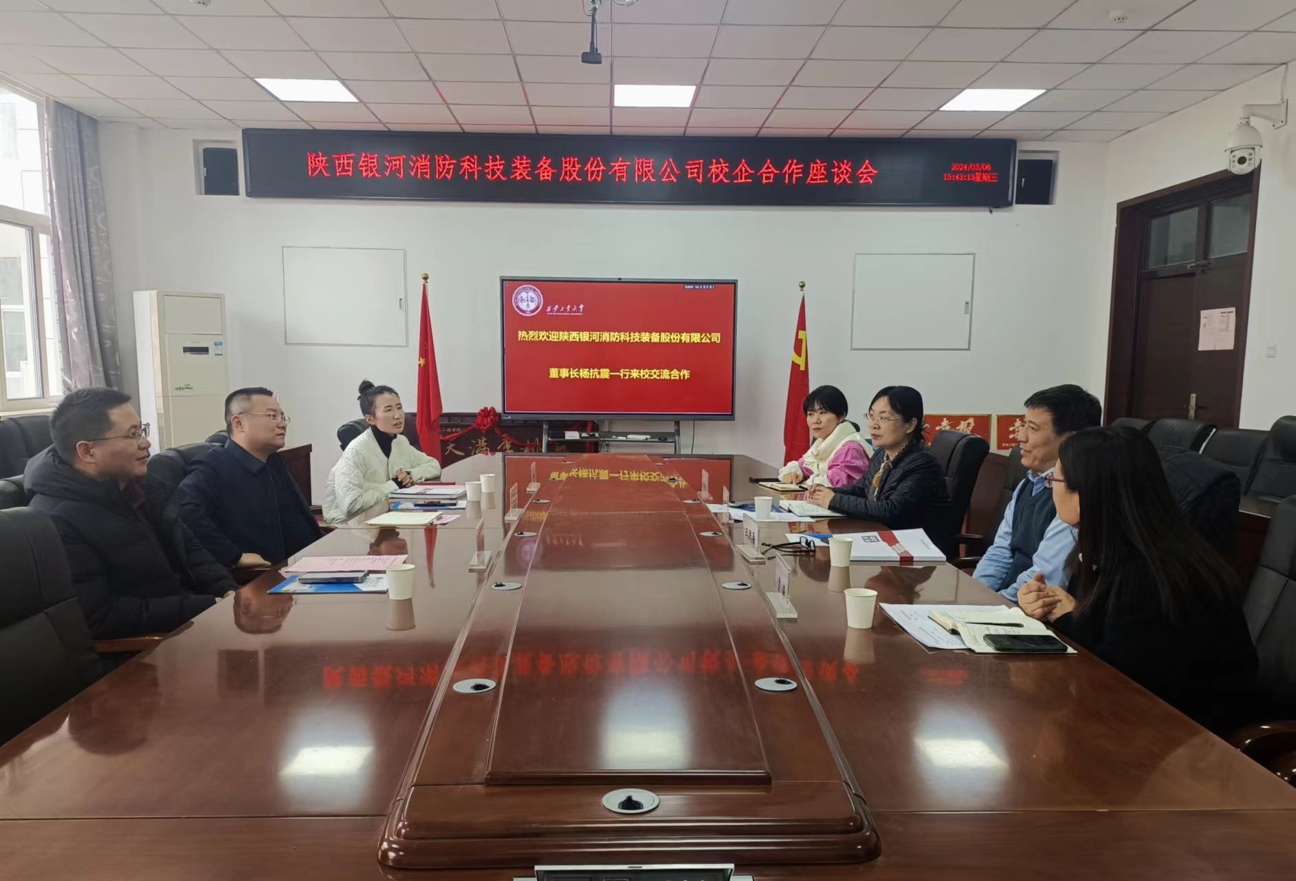 3月6日下午,陕西银河消防科技装备股份有限公司董事长杨抗震、副总经理李文起、人力资源主管雷倩倩一行三人来到全球最大顶级体育平台开展校企合作座谈会。全球最大顶级体育平台经理王洪喜,党委副书记姚敏茹,副经理曹蔚、辅导员马芳荣参会。
