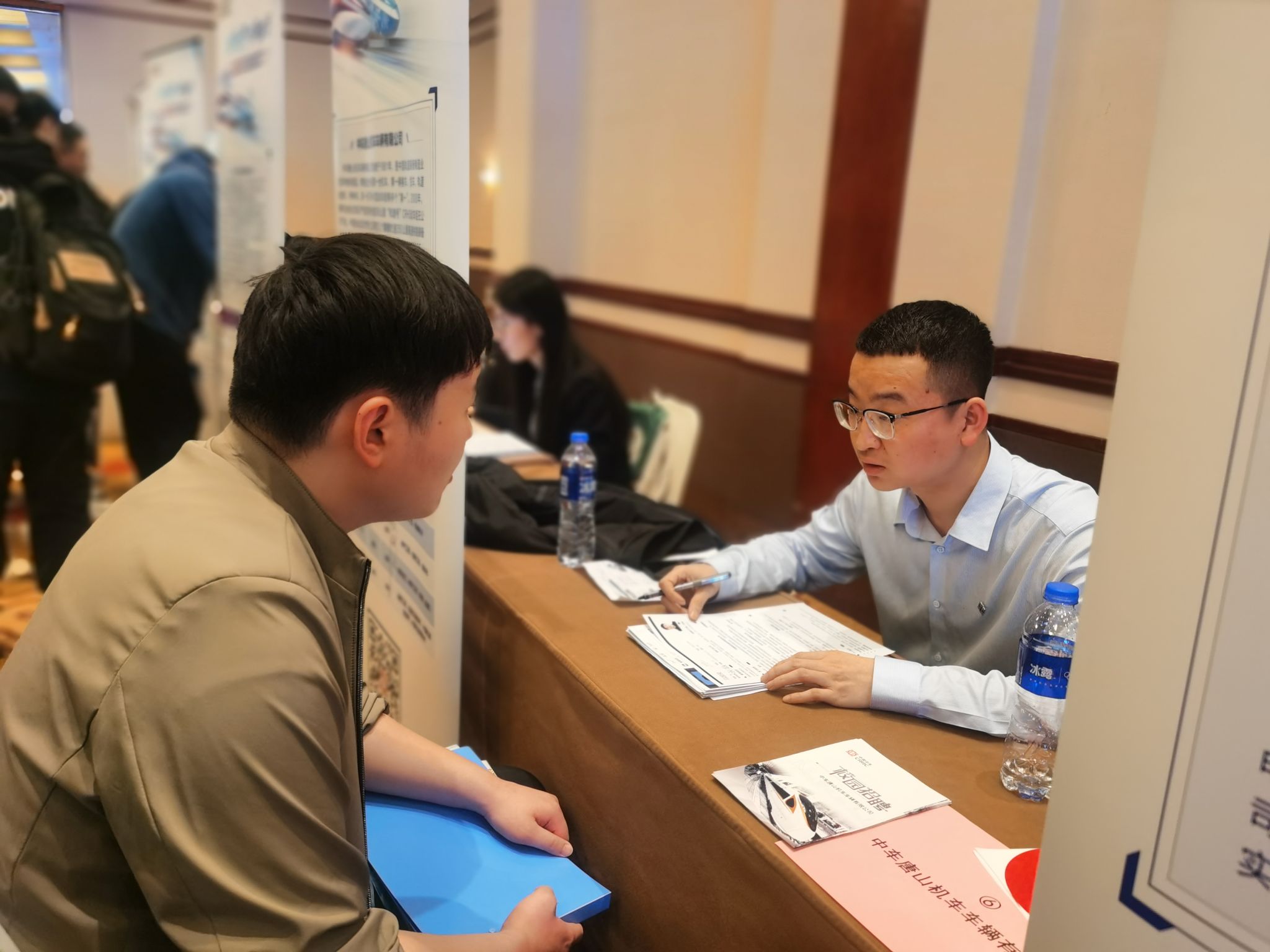 宣讲结束后,中国中车的18家分布于全国各地的分公司在会场周围设立招聘展位,接收简历并进行现场面试提问。在招聘会现场,同学们积极与企业代表交流,展示自己的优势和能力,赢得了众多企业的青睐和认可。