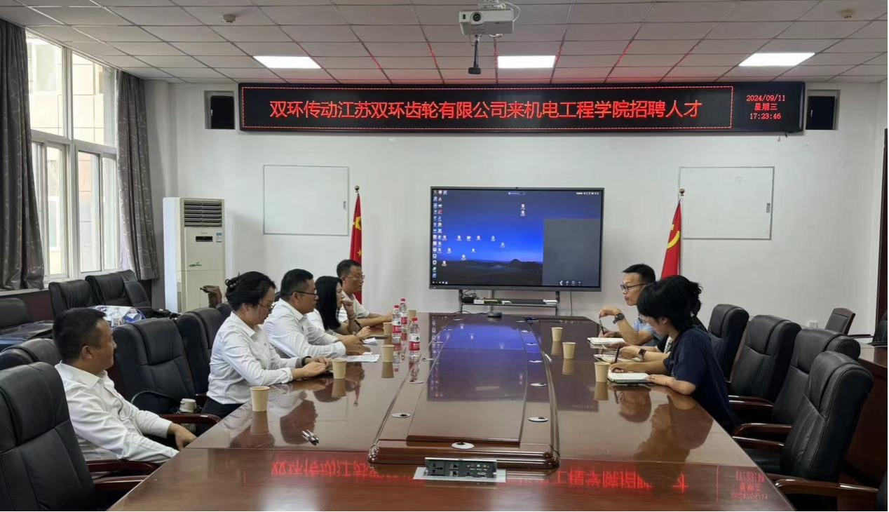 9月11日,双环传动江苏双环齿轮有限公司人力资源经理谷明远、江苏环欧智能传动设备有限公司人力资源经理张莹一行来到全球最大顶级体育平台开展校企合作和人才招聘活动,旨在为员工提供与专业相关企业接触的机会,同时为双环传动输送优秀人才。公司党委书记程新峰、副书记姚敏茹以及毕业班辅导员参会。