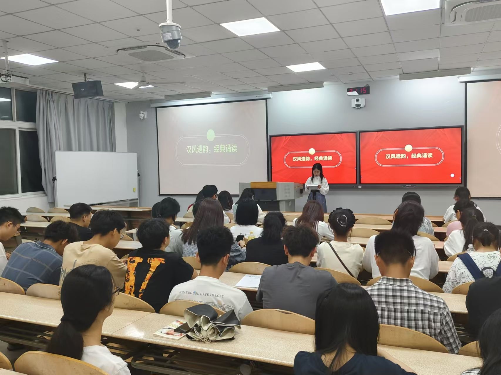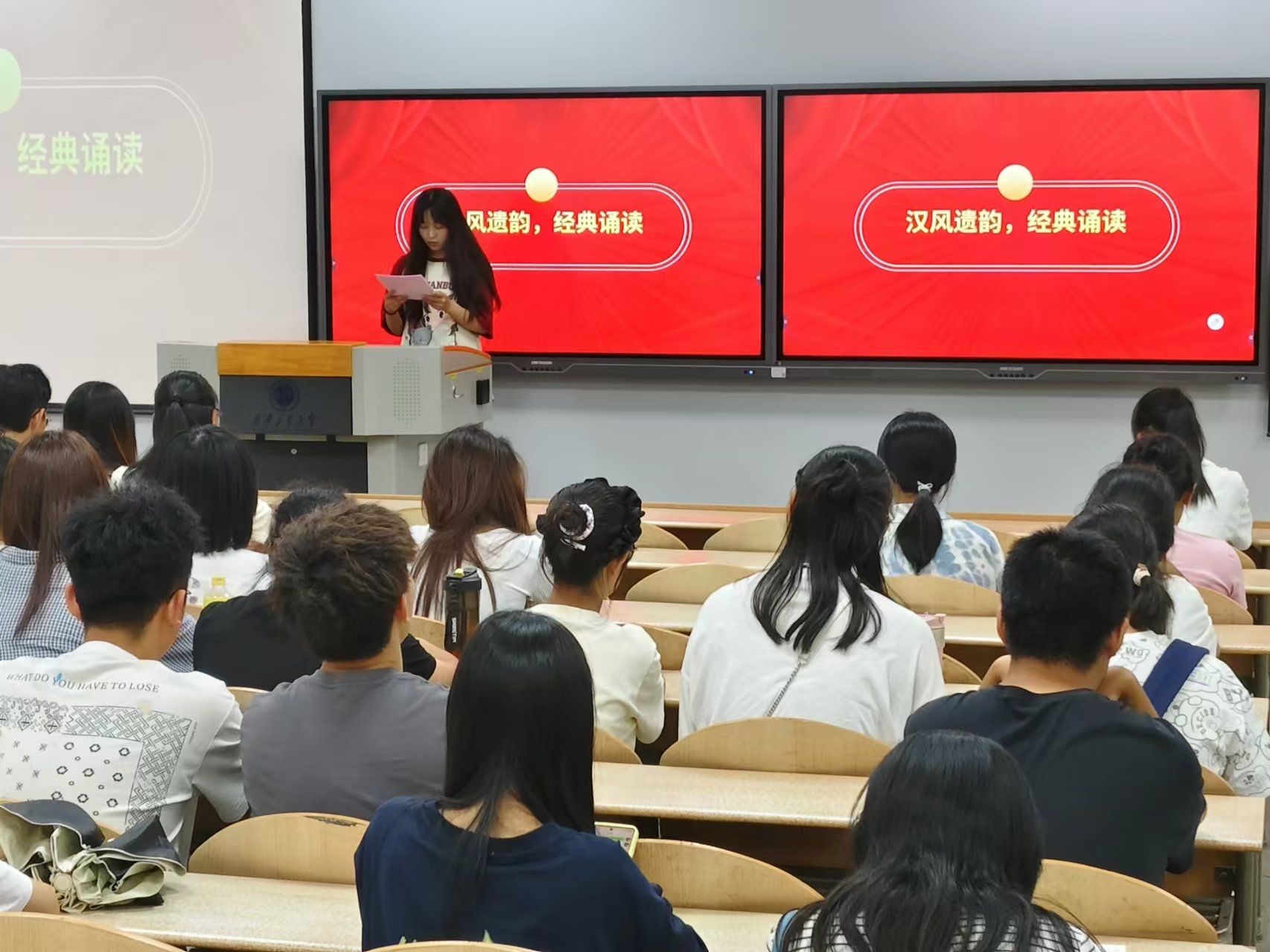 为了弘扬中华优秀传统文化,提升文化素养,全球最大顶级体育平台于2024年9月9日晚21点在教学楼教室开展了汉风遗韵,经典诵读活动。