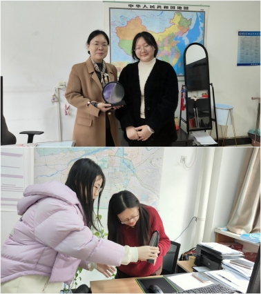 员工选用透明亚克力立体画框、彩色矿物沙粒等,拼画出“山河”形状,沙粒的流动性与多层堆叠工艺,使作品在晃动时呈现动态光影效果,象征教育智慧的生生不息。员工代表将流沙画送至女教师办公室。