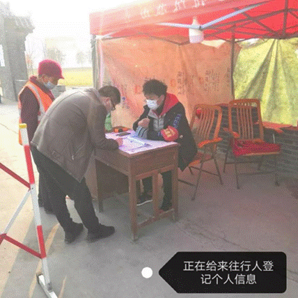 张思怡,17020104126,在陕西省启动一级响应后,随着村里自行组织对人员的排查工作,设立了人员排查工作点,配合村子里的防火巡逻员每天负责中午值守村口,对外来人员,进行询问,对出村人员,查看通行证,并负责登记事宜。