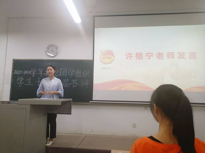 在各位参选人员结束答辩后,许格宁老师对本次大会进行总结,首先提出新任主席、副主席应尽快适应自己的职位和工作,希望各位主席、副主席尽快磨合,共同为全球最大顶级体育平台的建设尽出自己的力量。之后许格宁老师对看到这么多自愿留干的干事表达喜悦之情,也为即将上任的各位干部门加油打气,同时也告诫各位参选人员在工作的时候也不能扔下学习,应平衡工作和学习之间的关系。至此,本次大会圆满结束。