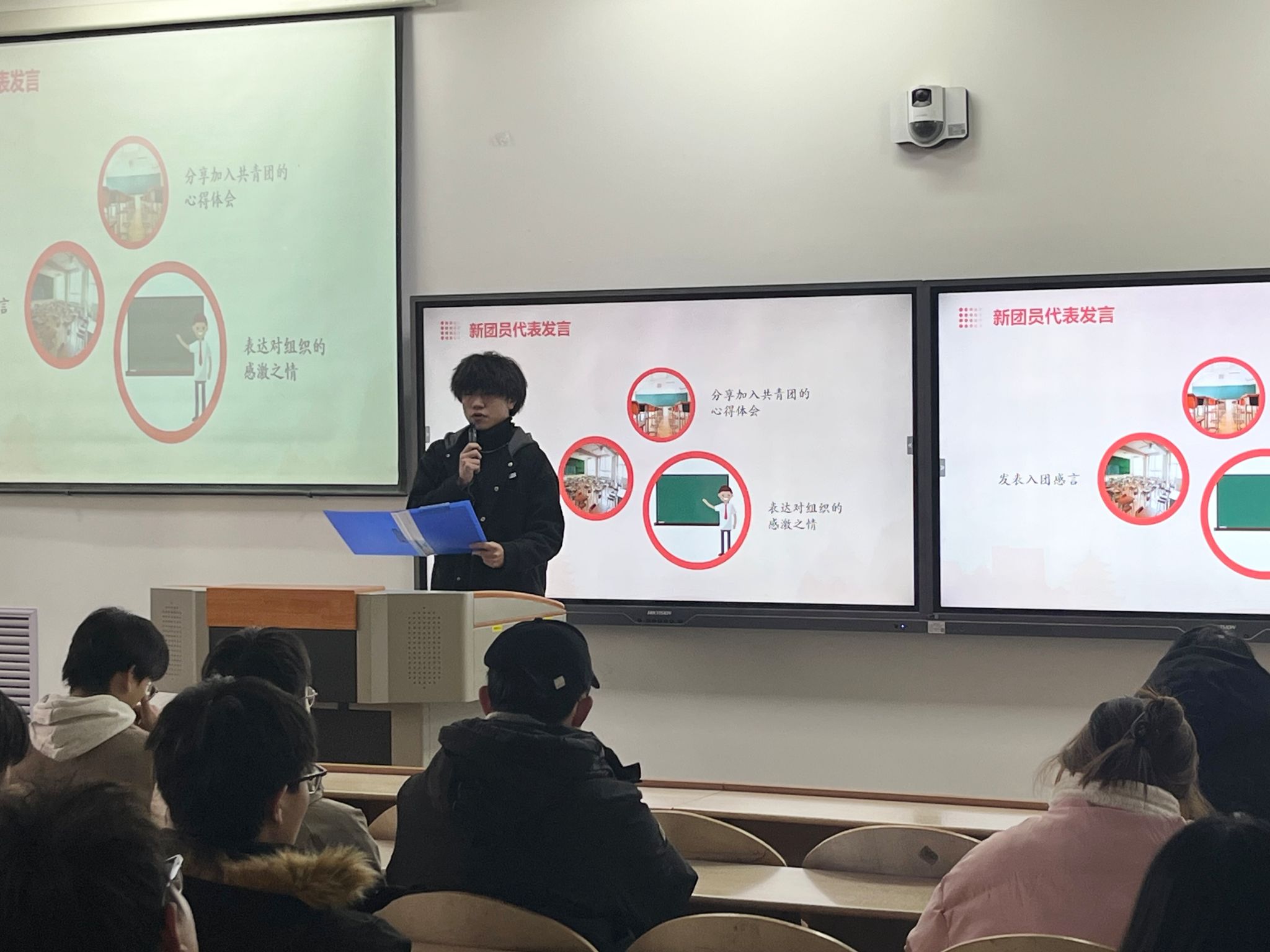 仪式第三项,新团员黄杨英男代表发言。他认为,新团员们作为新时代的接班人,必须勇于承担责任,积极参与社会主义建设,为实现中华民族的伟大复兴而不懈努力。